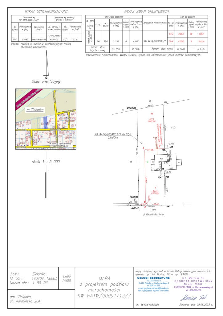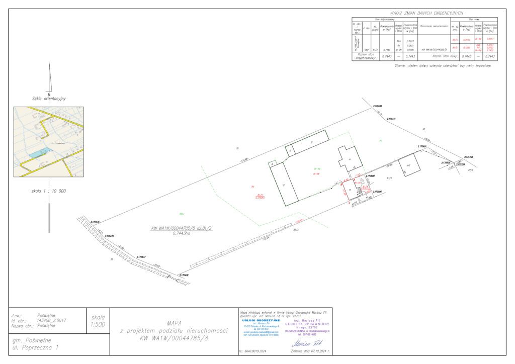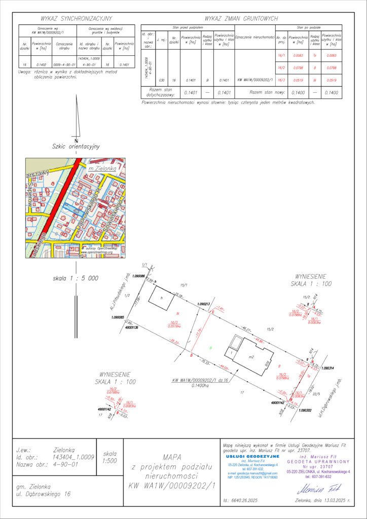 Dokumentacja ta jest niezbędna do wydania decyzji zatwierdzającej podział przez urząd oraz do wprowadzenia zmian w ewidencji gruntów i księdze wieczystej. Zawsze dbam, by podział był nie tylko zgodny z przepisami, ale także funkcjonalny – z zapewnieniem dostępu do drogi publicznej oraz praktycznego układu działek.